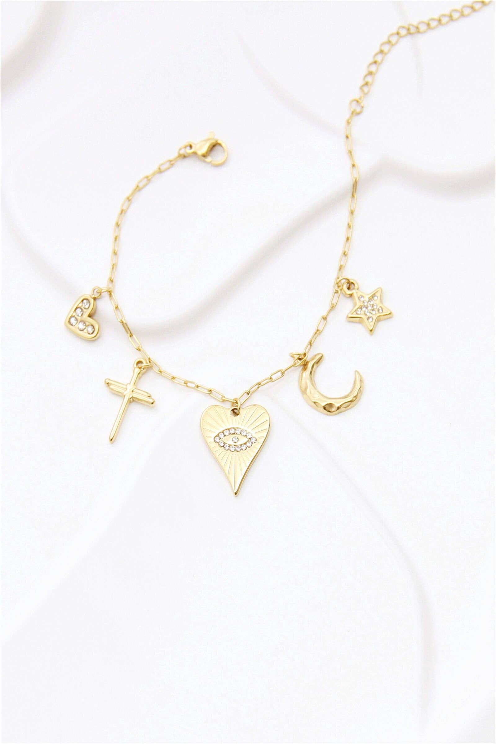 Le bracelet Célina en acier inoxydable plaqué or est une véritable ode à la féminité et à la lumière. Il réunit les symboles universels les plus puissants : un cœur tendre, une étoile étincelante, une lune mystérieuse, une croix délicate et un cœur sacré orné d’un œil protecteur. Chaque breloque, sublimée par de strass scintillants, illumine vos mouvements avec élégance.