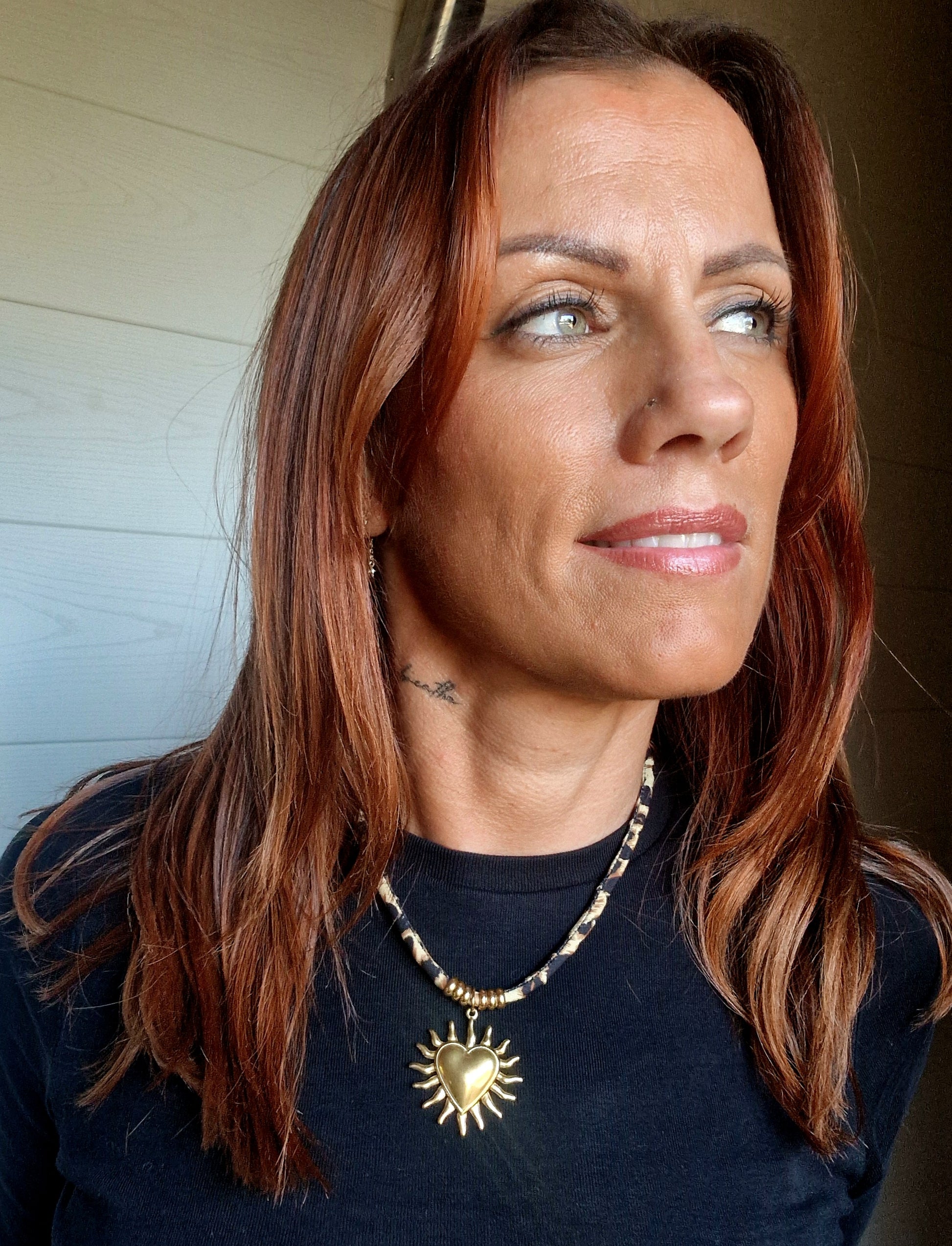 Sublimez votre style avec ce collier cœur ensoleillé plaqué or, monté sur un cordon tissu imprimé léopard qui lui confère une allure unique et tendance. Son pendentif en forme de cœur rayonnant comme un soleil symbolise à la fois l’amour, l’énergie et la force intérieure.