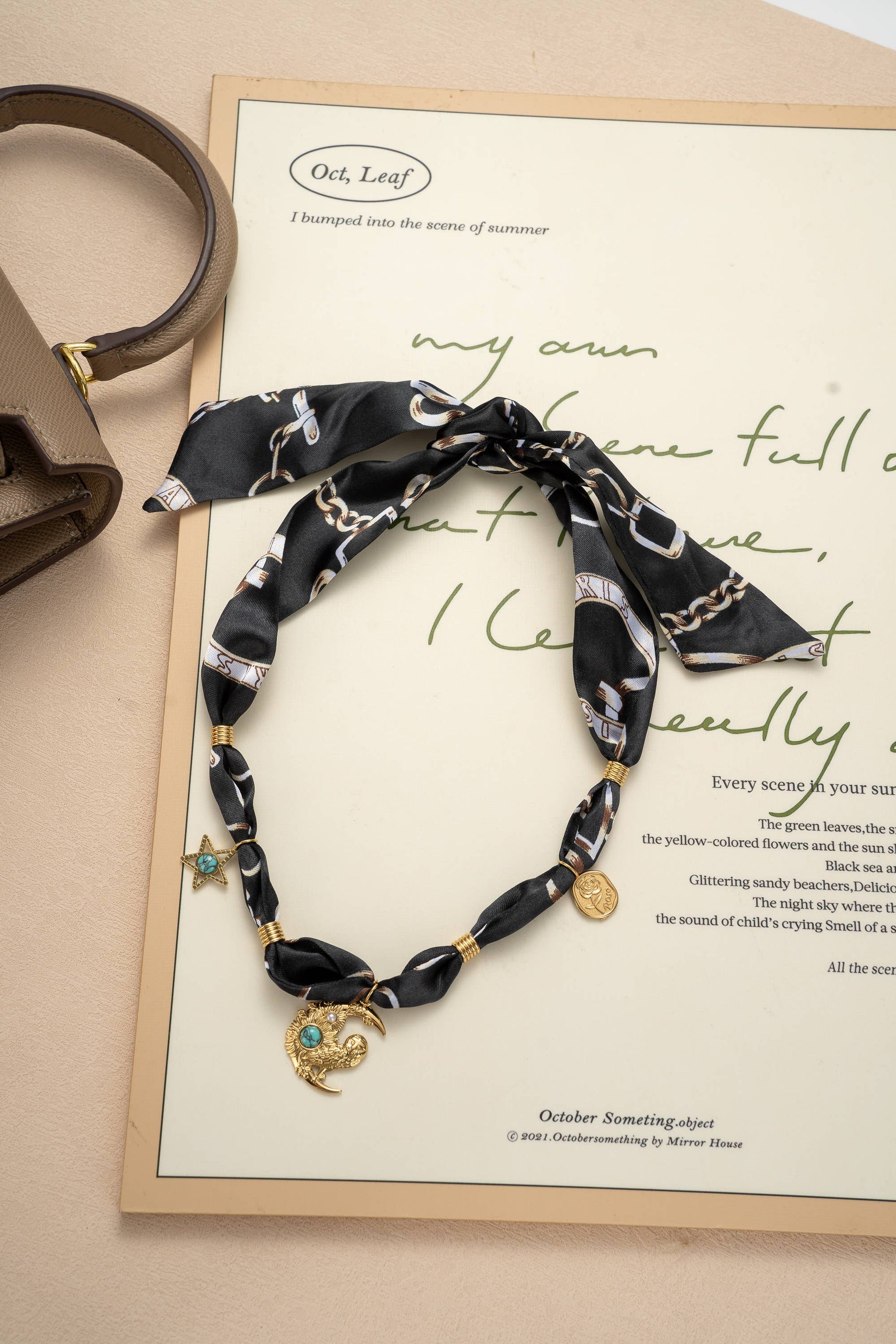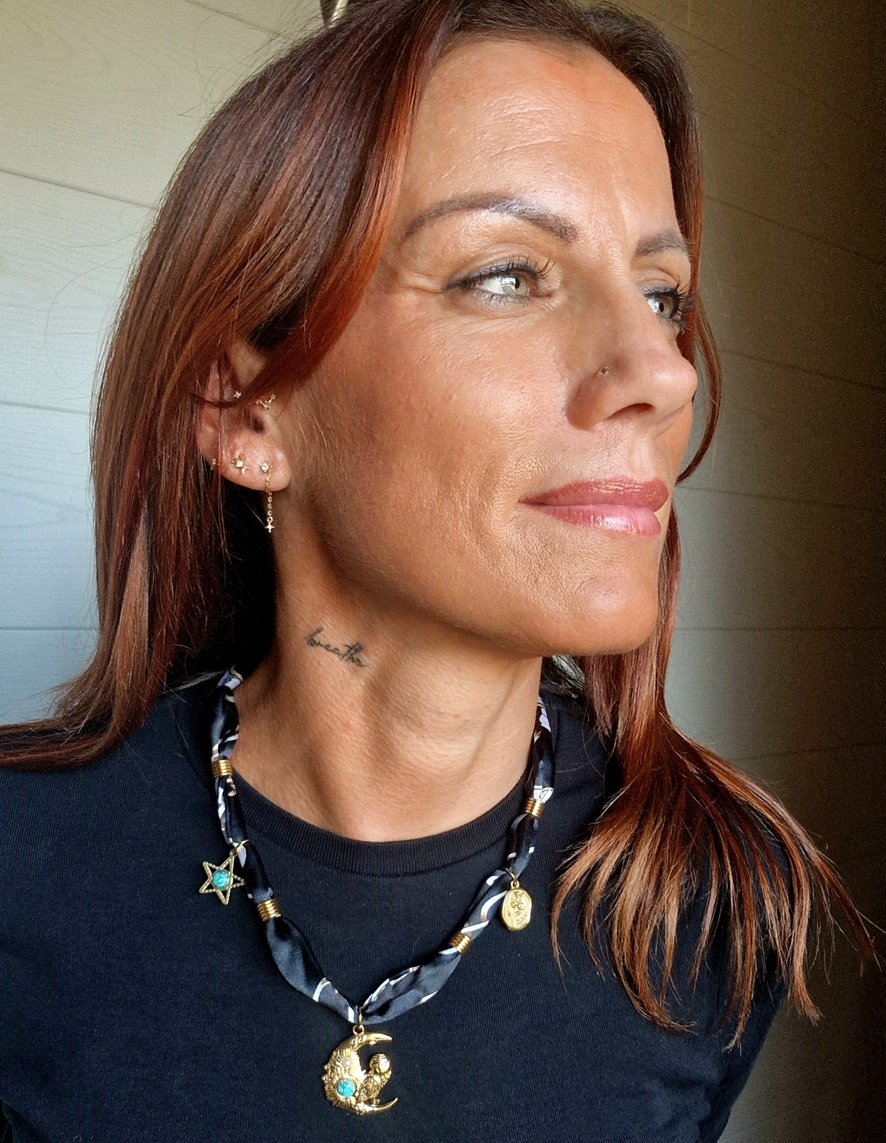 Ce collier foulard noir satiné est sublimé par de magnifiques pendentifs dorés – lune, étoile et médaille – ornés de pierres turquoise et de détails perlés. Original et raffiné, il marie la douceur d’un foulard en tissu à l’éclat du bijou pour un rendu unique.
