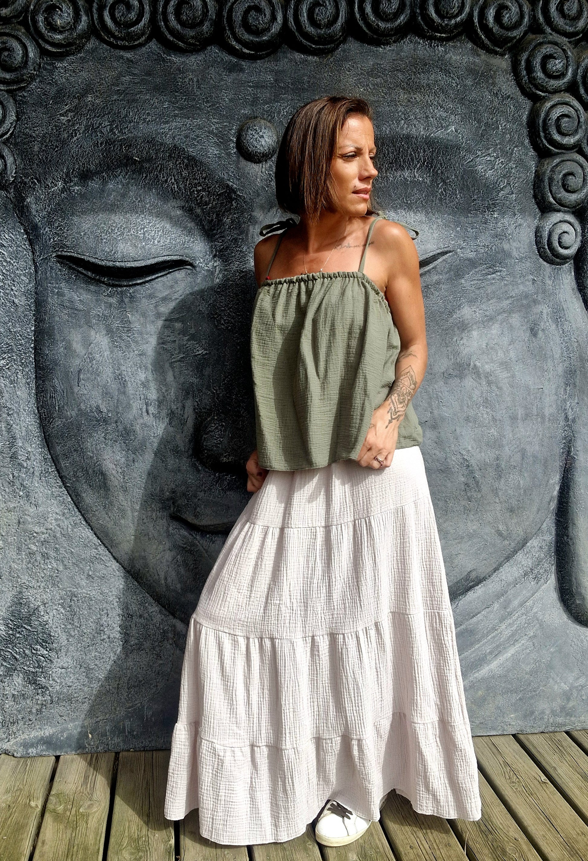 Confectionnée en gaze de coton ultra douce, cette jupe longue couleur beige offre un tombé aérien et féminin, avec sa taille élastique et ses larges volants.