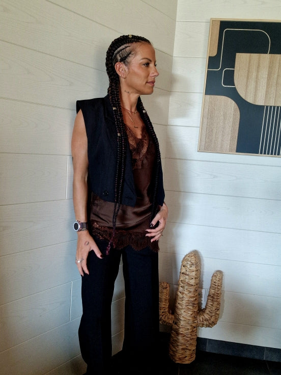 Le top Amaya séduit par sa dentelle délicate et sa couleur chocolat intense qui sublime toutes les carnations. Léger, fluide et féminin, il se porte aussi bien en journée sous une veste qu’en soirée pour un look élégant et sensuel.